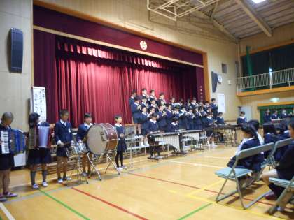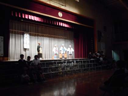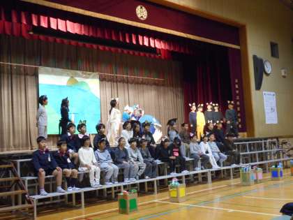 2年生は、11ぴきのねこたちが大きな魚を捕まえようと冒険の旅に出るお話です。ねこ、魚、ナレーターになりきって歌あり、ふりつけありで熱演でした。4年生は、狂言「附子」の児童劇版をしました。とんちを働かせた3人の小僧さんが楽しかったです。6年生は、「カンターレ!あかんたーれ」をしました。大阪の街を舞台にした歌を歌いました。合奏も行い、さすが6年生というすばらしい合唱・合奏でした。