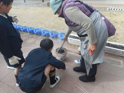 地域の女性部の方をゲストティーチャーに招いて、昔の道具である七輪を使ってお餅を焼きました。七輪に炭を入れて、火をつけるやり方を教えてもらいました。うちわで扇いで煙たかったけれど、がんばりました。焼いたお餅や学習園で育てた田辺だいこん、天王寺かぶらを入れたみそ汁を食べました。とてもおいしかったです。