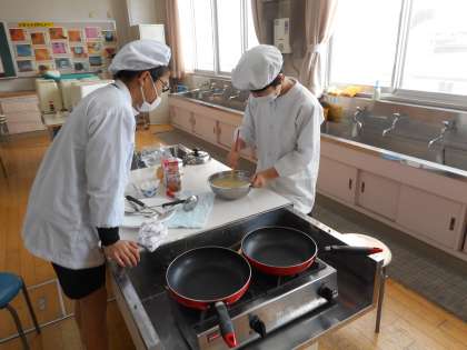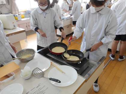 家庭科の学習に「家族のためにパーティーをしよう」という単元があります。各班で予算、材料、献立などを自分たちで考えました。クレープ、クッキー、バナナケーキ、ホットケーキの4種類を作りました。家族の人が喜ぶようなおいしいものが出来上がりました。