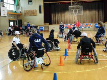 国際親善女子車いすバスケットボール大阪大会に出場するイギリスチームの選手と4年生が交流をしました。選手による車いす操作やシュートなどのデモンストレーションを見て、大歓声。そのあと、選手に教えてもらいながら車いすバスケットボール体験をしました。児童代表と選手によるミニゲームでは、選手の素早い動きやパス回しに驚きました。児童代表チームも健闘して、1回だけシュートが決まり、大変盛り上がりました。