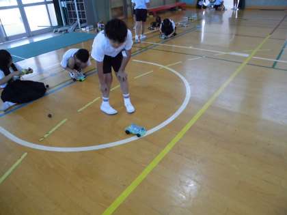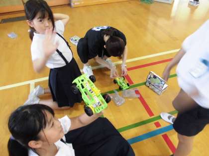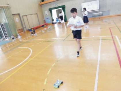 実験セットが完成したので、今日は講堂で試運転しました。自分で組み立てたモーターカーを走らせるので、どの子もいきいきと良い表情でした。