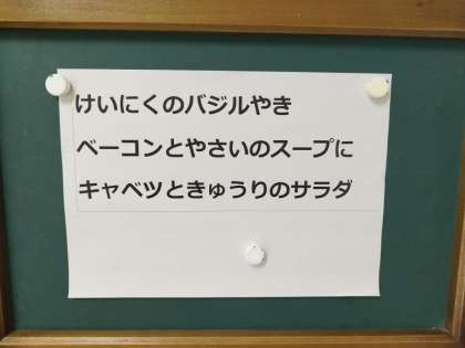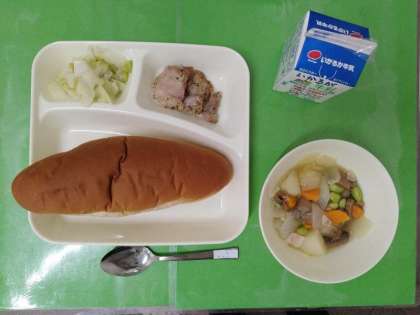 今日の献立は、黒糖パン、鶏肉のバジル焼き、ベーコンと野菜のスープ煮、キャベツとキュウリのサラダです。
