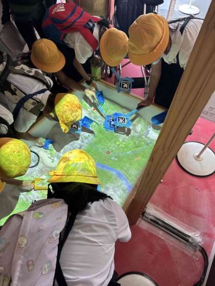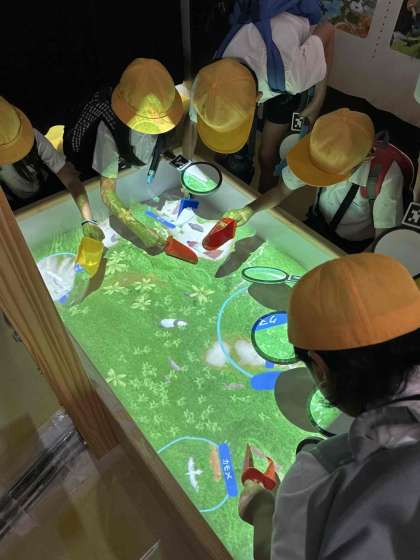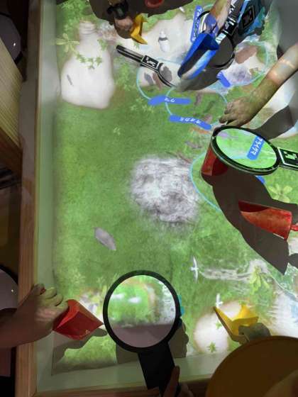 砂の中に埋められたバーチャルな宝ものを掘り当てるという展示です。デジタル虫眼鏡や宝物発見レーダーを使って必死に宝物を探しています。