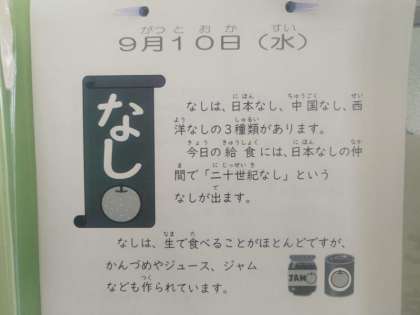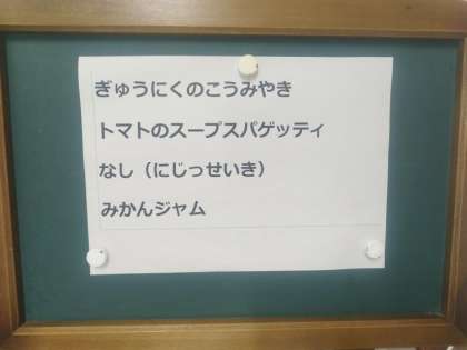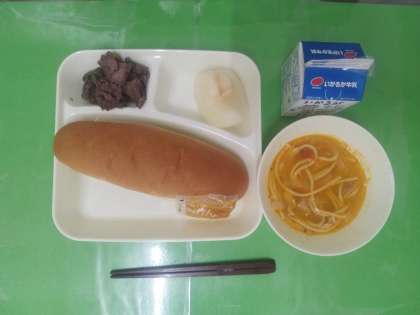 今日の献立は、コッペパン、牛乳、牛肉の香味焼き、トマトのスープスパゲッティ、なし(二十世紀)、みかんジャムです。