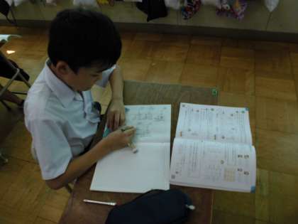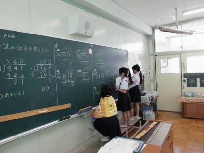 3けた÷2けたの学習です。ひっ算にした場合、どこに商を立てればよいのか考えながら慎重に計算しています。