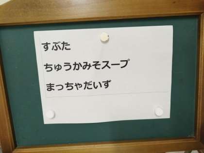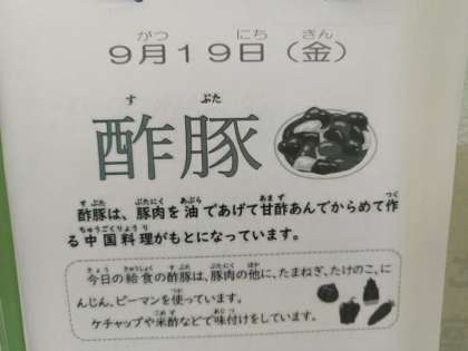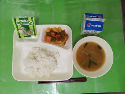 今日の献立は、ごはん、牛乳、酢豚、中華みそスープ、抹茶大豆です。