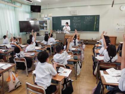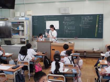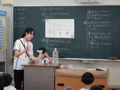 いろいろな比べ方でどちらが多いのかを考えています。太さ?長さ?大きさ?どのように比べるとわかりやすいのか、たくさんの考え方が出ました。