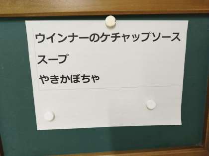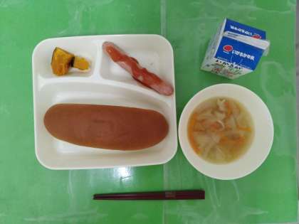 今日の献立は、黒糖パン、牛乳、ウインナーのケチャップソース、スープ、焼きかぼちゃです。