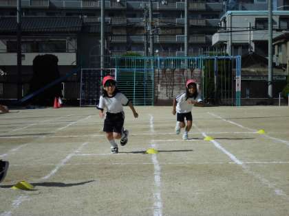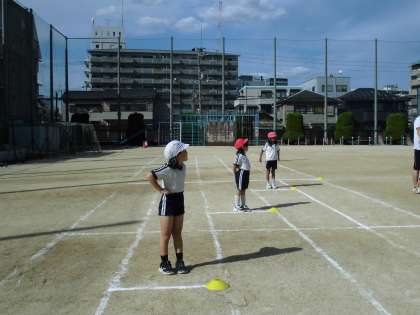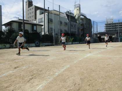 徒競走の練習をしました。昨年よりもスピードアップしているので、カーブを上手に回ることができれば直線でさらにスピードアップできます。