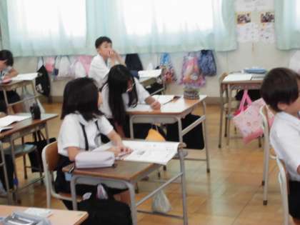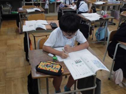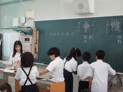 今日の新出漢字は「戦」「争」です。また、練習問題もあり、前に出て発表していました。