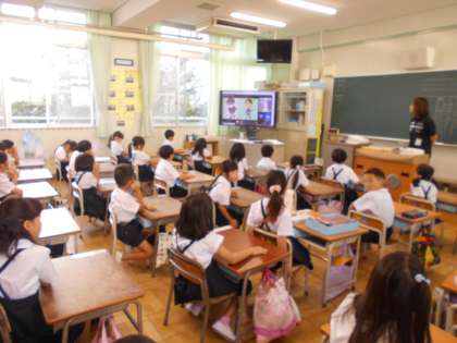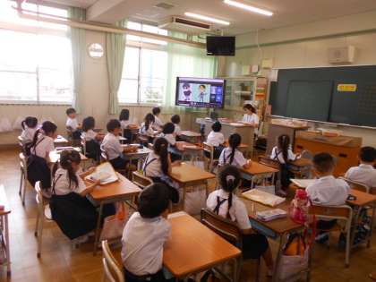 リモート朝会で校長先生と元気に朝の挨拶をしています。