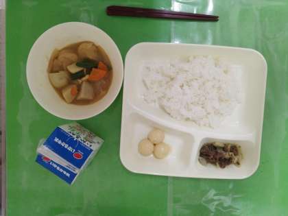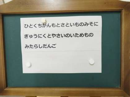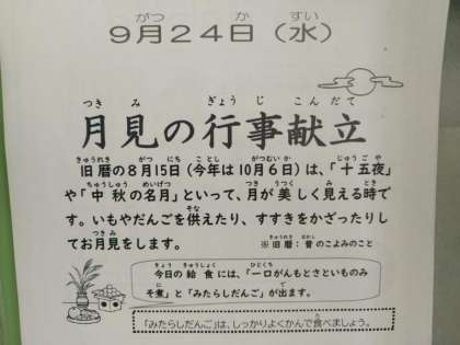 今日は月見の行事献立です。献立は、ごはん、牛乳、一口がんもと里いものみそ煮、牛肉と野菜のいためもの、みたらし団子です。