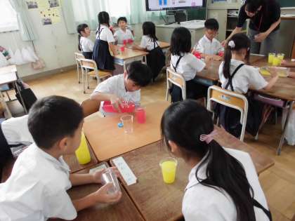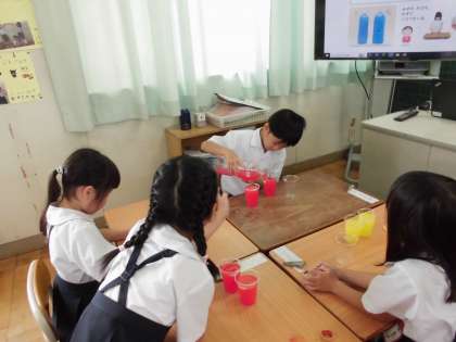 2つのペットボトルに入っている水の量は、どちらがどれだけ多いか、調べる学習です。