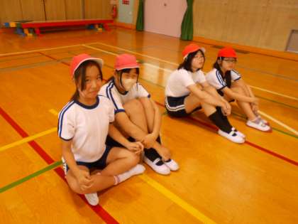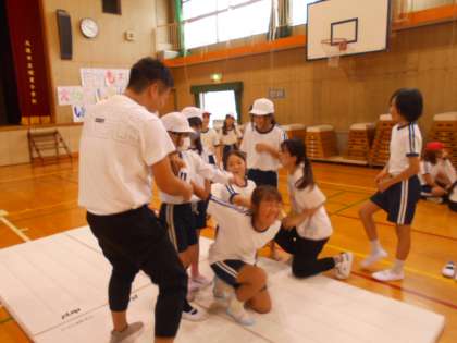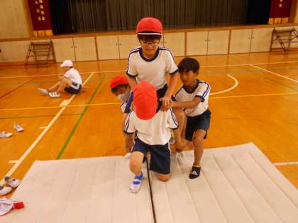 体育館にマットを敷いて、安全に考慮して初めての騎馬を組みます。5年生にとっては未知の世界です。慣れるまで時間がかかりますが、がんばりましょう。