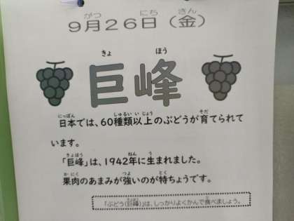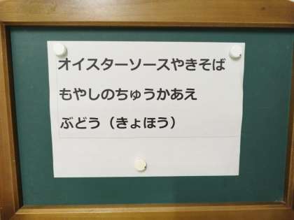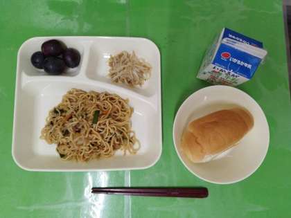 今日の献立は、ミニコッペパン、牛乳、オイスターソース焼きそば、もやしの中華あえ、ぶどう(巨峰)です。