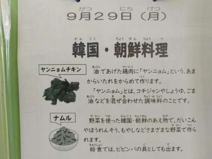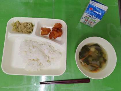 今日の献立は、ごはん、牛乳、ヤンニョムチキン、とうふのスープ、切干しだいこんのナムルです。