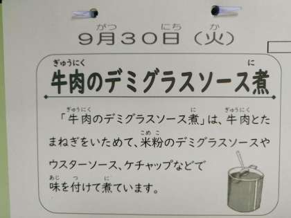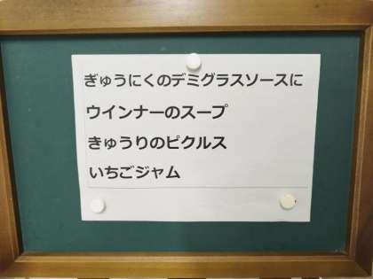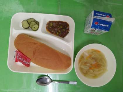 今日の献立は、コッペパン、牛乳、牛肉のデミグラスソース煮、ウインナーのスープ、きゅうりのピクルス、いちごジャムです。