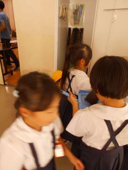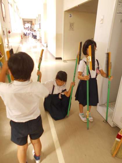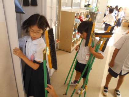 掃除中も静かに集中しています。掃除ロッカーの中もきれいにほうきを並べています。安全に、次に使う人にわかりやすい。