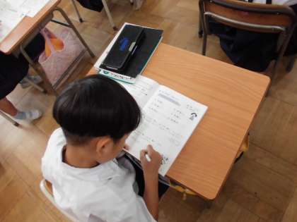 10をこえる足し算の学習をしています。まずは10のまとまりを作ってからあといくつかな・・・。練習あるのみ。頑張って!