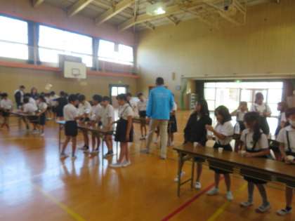 大阪市水道局の方に来ていただき、水道水と天然水の違いについて飲み比べをするという活動がありました。高度濾過処理により、大阪市の水道水はとてもおいしく品質を保つことができているそうです。