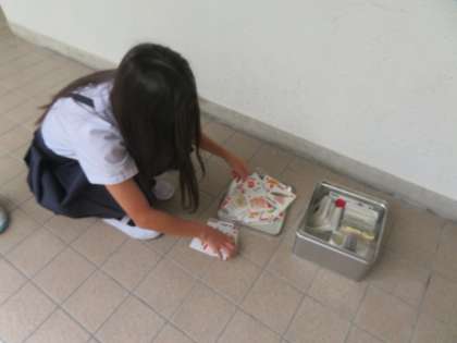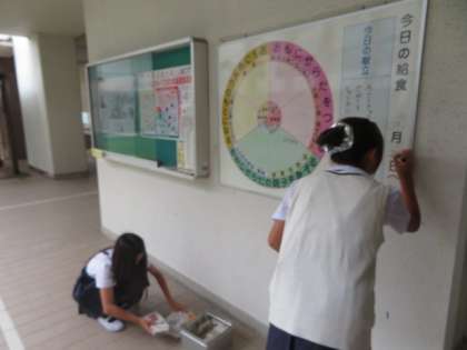 雨も止んで、傘いらずの登校です。少し休みの日の疲れが見られますが、元気に登校しています。5年生が給食委員会の献立掲示板を整理しています。