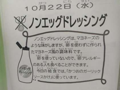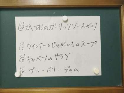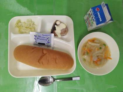今日の献立は、コッペパン、牛乳、カツオのガーリックソースかけ、ウインナーじゃがいものスープ、キャベツのサラダ、ブルーベリージャムです。