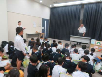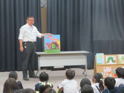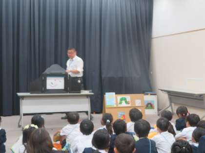 かみしばいで、図書館について、わかりやすく説明していただき、大型絵本の読み聞かせもしていただきました。質問タイムでは調べたいことを直接聞くことができました。一番大変なことは、探している本が見つからないときだそうです。学校の図書室でも、返却の期日を守ろうと思います。
