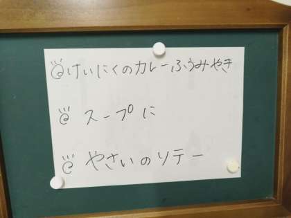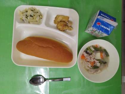 今日の献立は、パンプキンパン、牛乳、鶏肉のカレー風味焼き、スープ煮、野菜のソテーです。