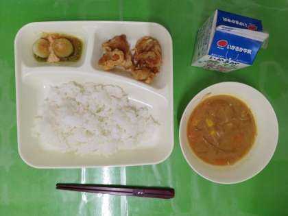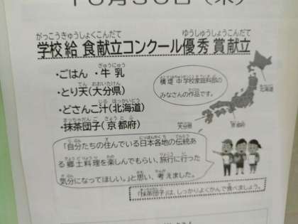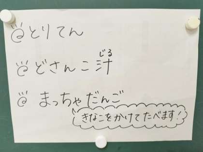 今日の献立は、ごはん、牛乳、とり天、どさんこ汁、抹茶団子です。