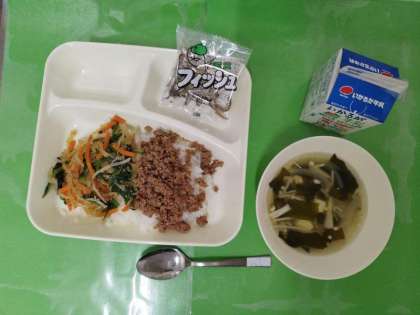 今日の献立は、ごはん、牛乳、ビビンバ、わかめスープ、ミニフィッシュです。
