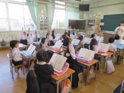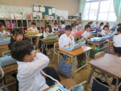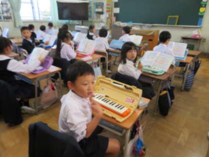 鍵盤ハーモニカで3つの音を演奏します。ペアで聞き合ったり、グループで聞き合ったりすることで、自分が演奏している音を意識しています。息遣いもちょうどよく、息継ぎも上手です。階名を言ってから、終わりに全員で「日の丸」を演奏しました。上手に演奏できました。