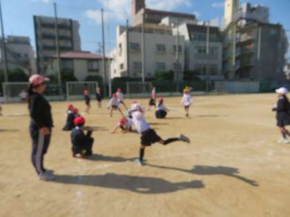 全員遊びでドッジボールを楽しんでいます。ボールを受けるのが苦手な子に、ゆっくりなボールを投げているところにやさしさを感じました。