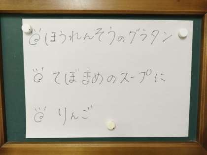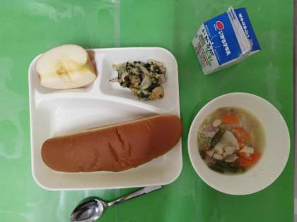 今日の献立は、黒糖パン、牛乳、ほうれん草のグラタン、てぼ豆のスープ煮、りんごです。