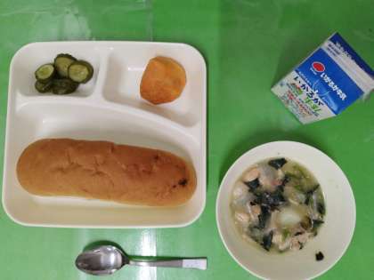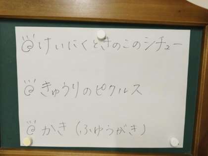 今日の献立は、レーズンパン、牛乳、鶏肉ときのこのシチュー、きゅうりのピクルス、柿(富有柿)です。