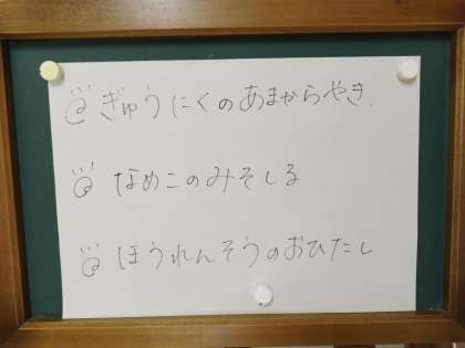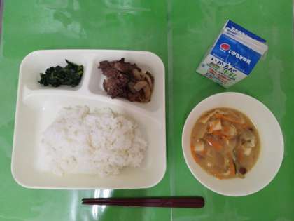 今日の献立は、ごはん、牛乳、牛肉の甘辛焼き、なめこのみそ汁、ほうれん草のおひたしです。
