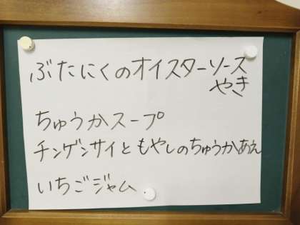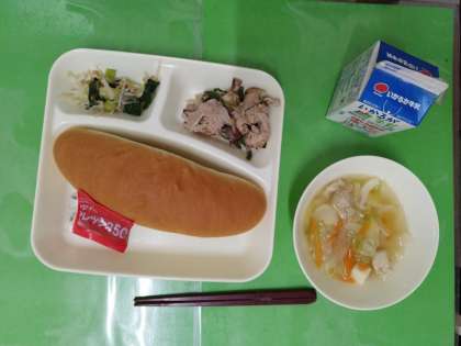 今日の献立は、コッペパン、牛乳、豚肉のオイスターソース焼き、中華スープ、チンゲンサイともやしの中華あえ、いちごジャムです。