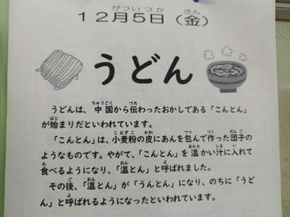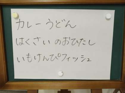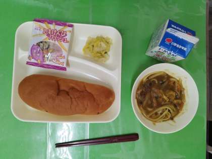 今日の献立は、おさつパン、牛乳、カレーうどん、白菜のおひたし、芋けんぴフィッシュです。