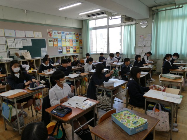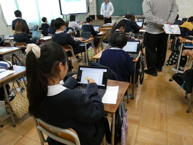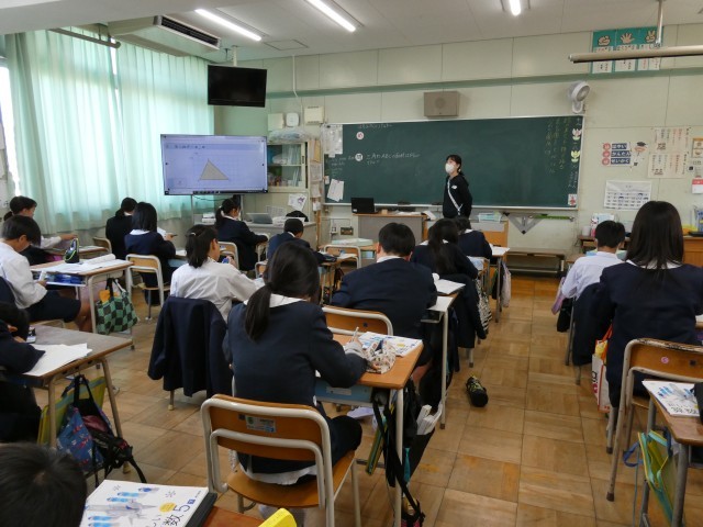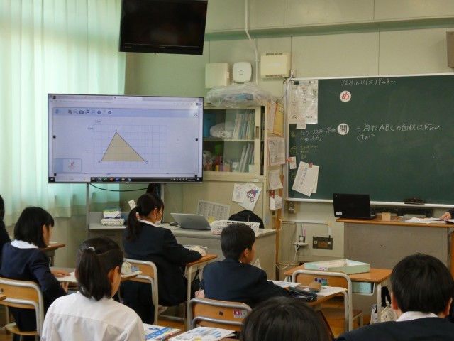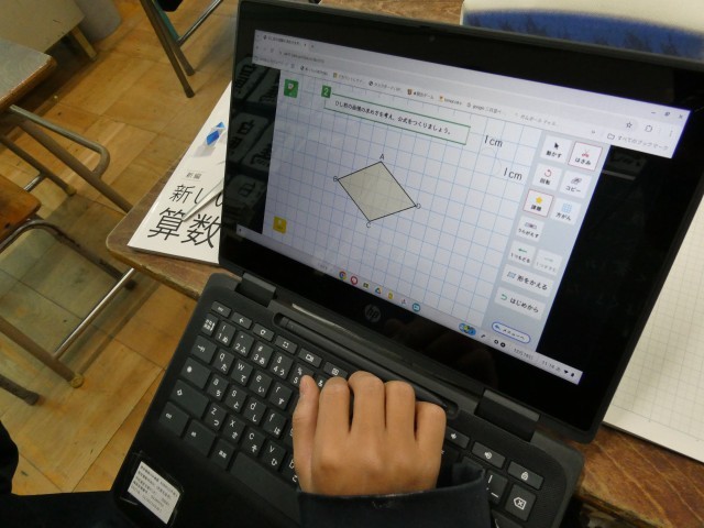 いろいろな図形の面積を求める学習を行っていますが、今日は三角形です。前の時間の平行四辺形を基に公式を考えます。また、端末を使って回転させたり切り取ったりしながら考えを深めていきます。