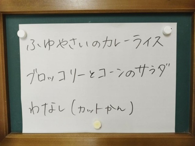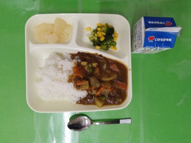 今日の献立は、冬野菜のカレーライス、ブロッコリーとコーンサラダ、和なし(カット缶)、牛乳です。