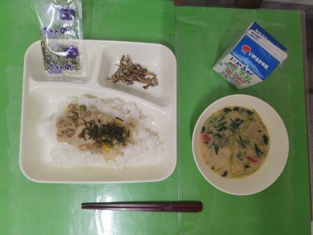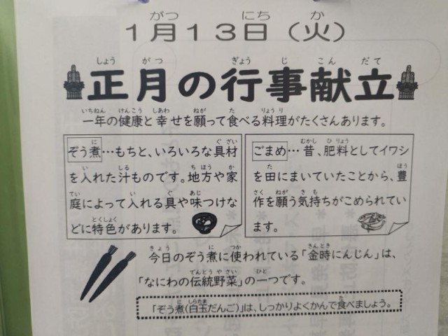 今日の献立は、れんこんのちらし寿司、ぞう煮、ごまめです。ぞう煮とごまめはおせち料理の一つです。ごまめはかえり(カタクチイワシの稚魚)を使用しています。今月は全部で6種類のおせち料理が登場します。