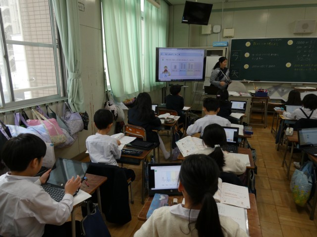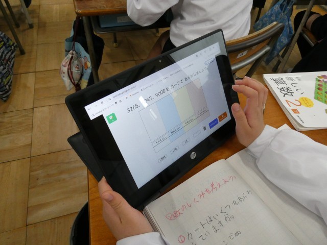 大きな数の学習を行っています。”3226”であれば1000が3つ、100が2つ・・・というようにどのような組み合わせでできているのかという事を端末を活用して考えています。指を使って直感的に操作することで視覚的にもわかりやすく理解が深まりました。