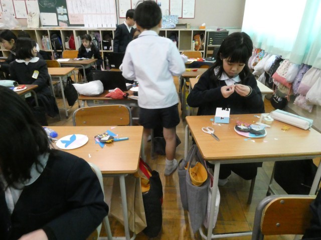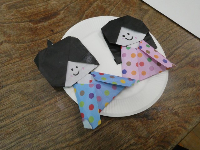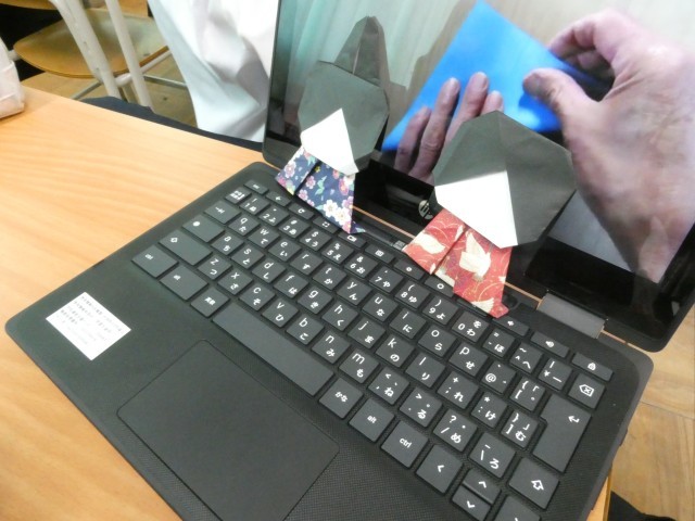 お雛様とお内裏様を折り紙で作りました。端末で動画を見ながら作成すると上手にできましたね!