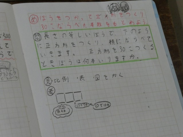今日は棒を使って正方形を30個作るときに必要な棒の本数を計算で求める。という学習をしました。PCで表や図を使って考え方を深めました。1+3×30=91 などいくつかの考え方がでていましたが、「きまりを見つけることで計算できる」というまとめにつなげることができました。