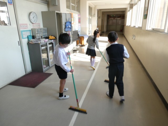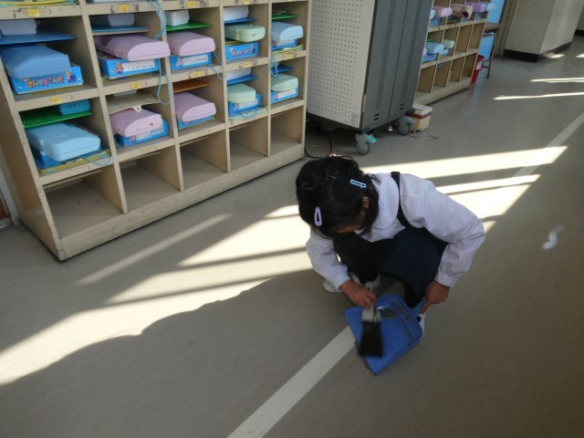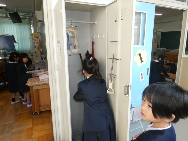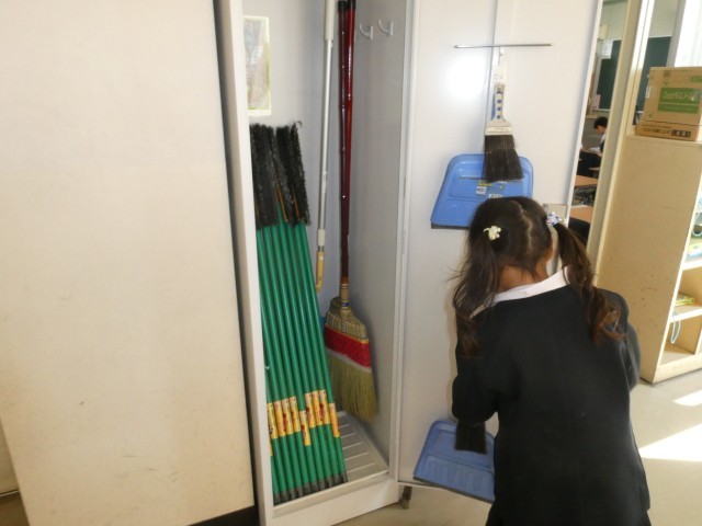 掃除時間はもくもく清掃です。柏里小学校全体で取り組んでいます。掃除ロッカーの中も整理整頓しておくと、次の時に安全に取り出すことができますね。