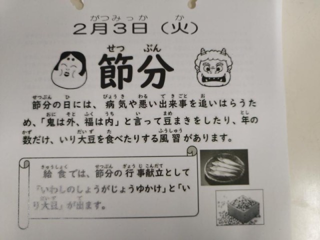 「まめ=魔滅(まめつ)」を食べて「鬼=病や災い」をはらうということから、節分に大豆をいった福豆を食べるようになったと言われています。また、いわしは食べるだけでなく、焼いた鰯の頭を柊の枝に刺し、魔除けとして飾る風習もあります。