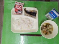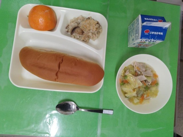 今日の献立は、黒糖パン、牛乳、押し麦のグラタン、スープ、いよかんです。