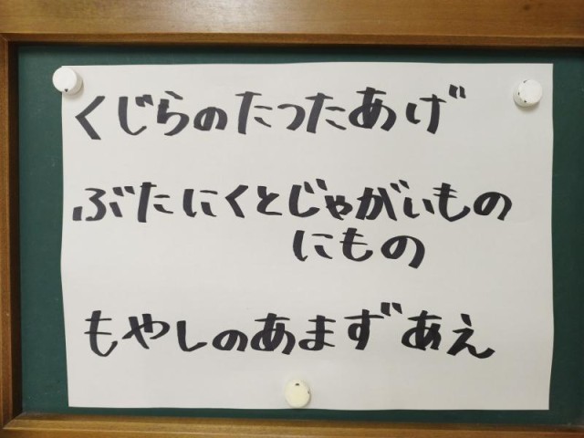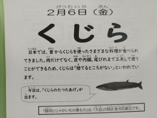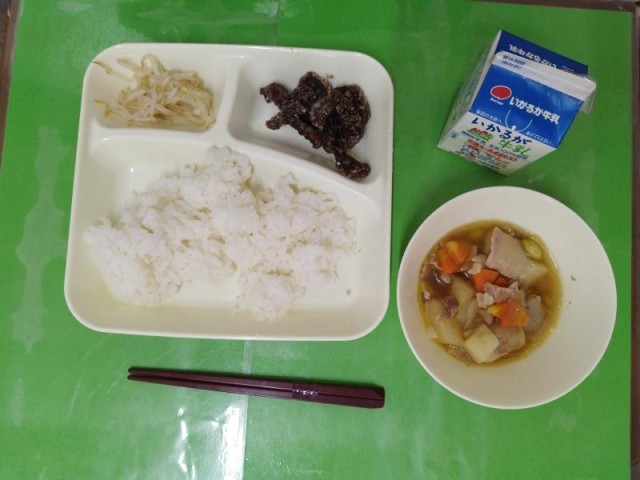 今日の献立は、ごはん、牛乳、くじらのたつたあげ、豚肉とじゃがいもの煮もの、もやしの甘酢あえです。