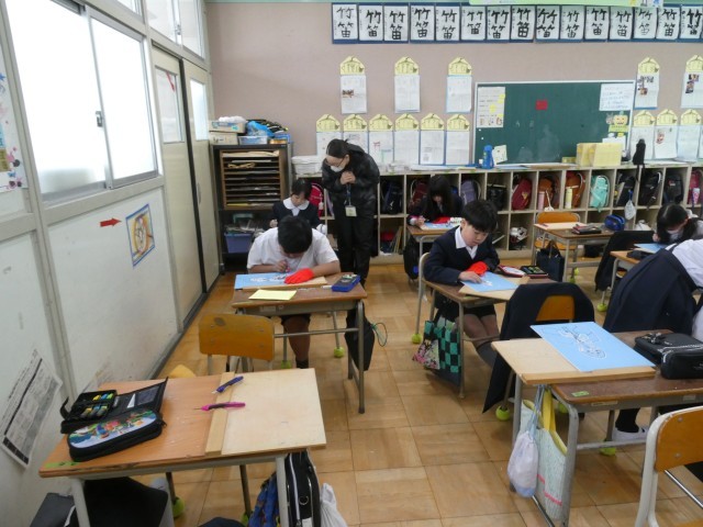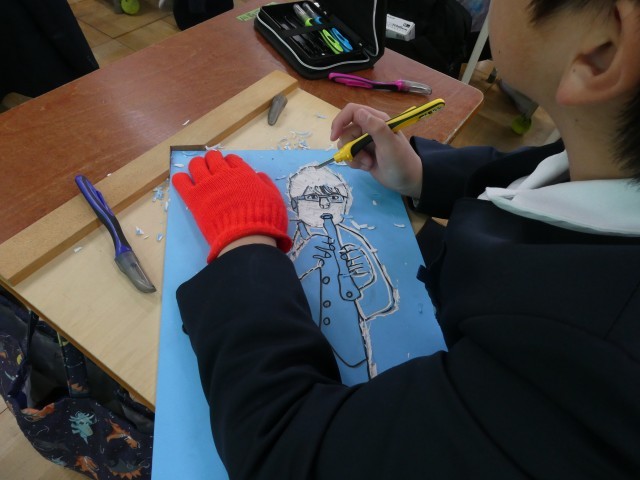リコーダーを吹いているいる自分を表現しています。細かい所まで集中して彫っています。