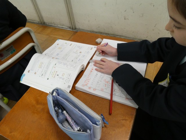 2けた×2けたのひっ算の学習です。ひっ算に階段を書いてから計算を始めます。今日、しっかりと教えてもらったので、後は練習あるのみです。