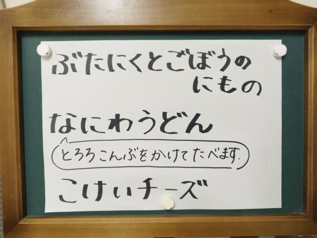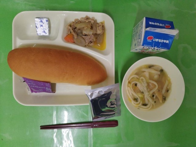 今日の献立は、コッペパン、牛乳、豚肉とごぼうの煮もの、なにわうどん、固形チーズ、ブルーベリージャムです。